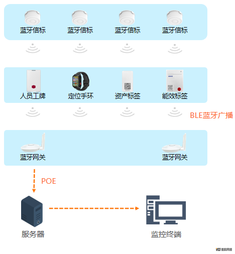 3.蓝牙网关:接收定位标签上传的位置数据,并通过POE网线回传至服务器;