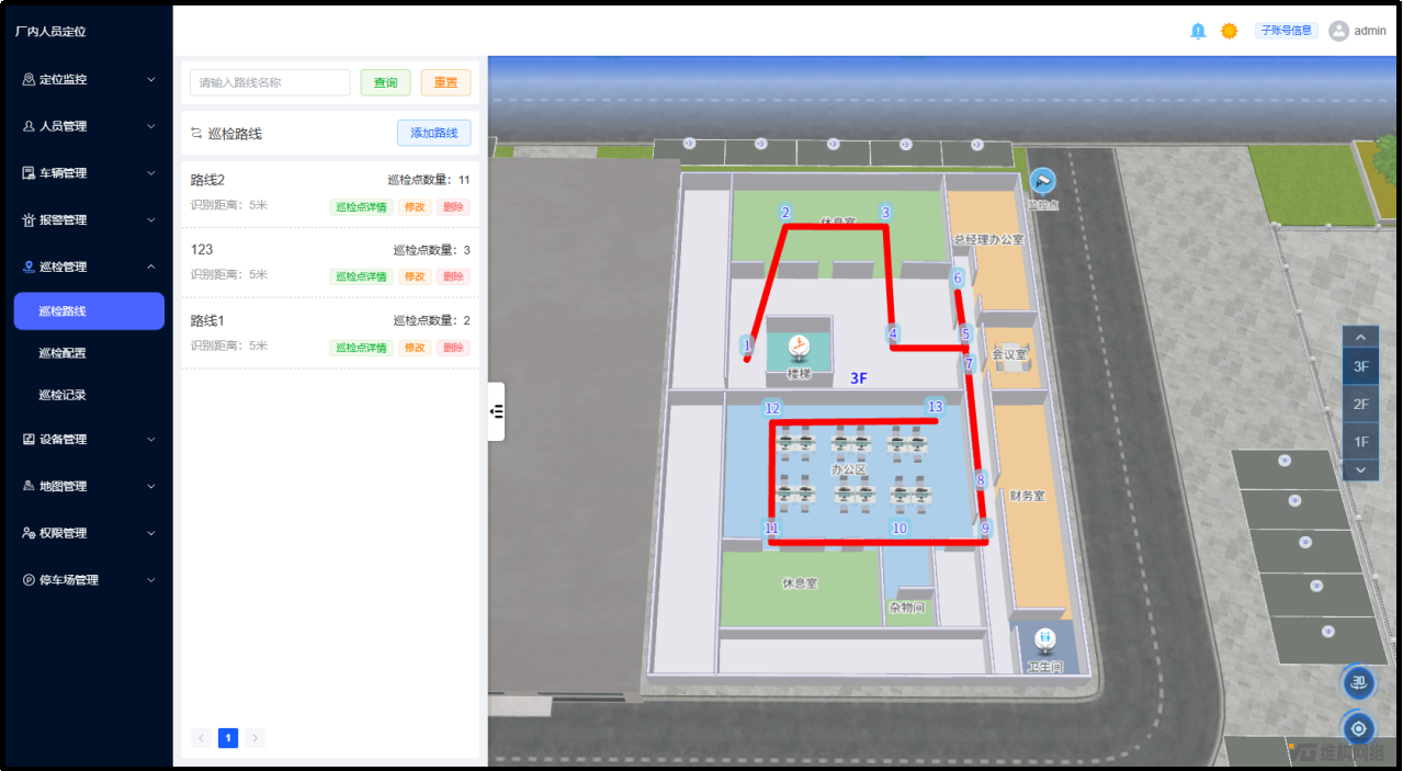 1)制定巡检路线:支持管理人员设定多个巡检点、配置多条巡检路线;