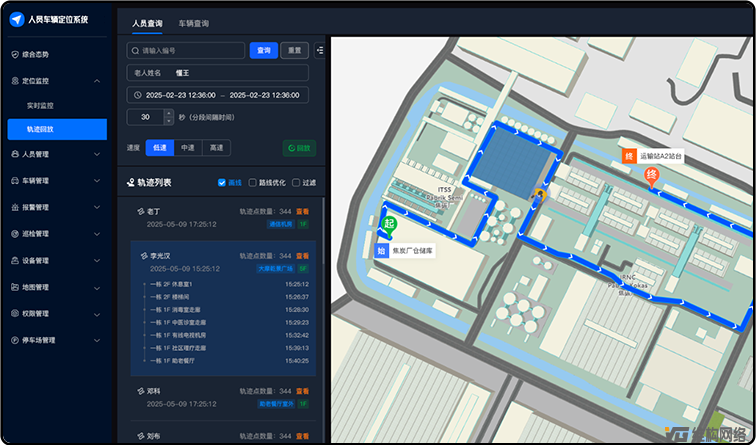 选择指定人,自由设置任意时间段,查询移动轨迹;支持轨迹回放,多倍速可调节 ;可在路径中查看出现在各区域点位的时间;室内室外轨迹无缝切换,楼层之间轨迹连续。