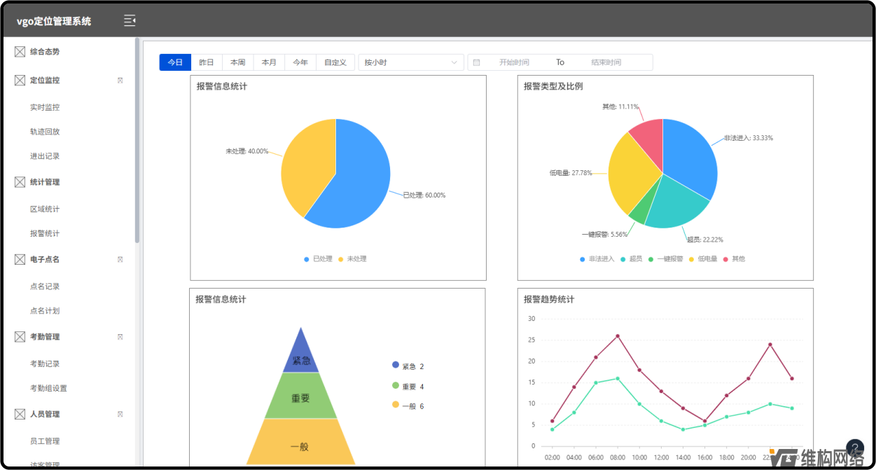 区域统计实时统计每个区域内的被监管人员的数量;报警统计对报警信息进行统计分析,通过饼状图、曲线图等图表展示报警信息、报警类型、报警趋势等多方面数据;支持按日、周、月、年,以及自定义时间段查询。
