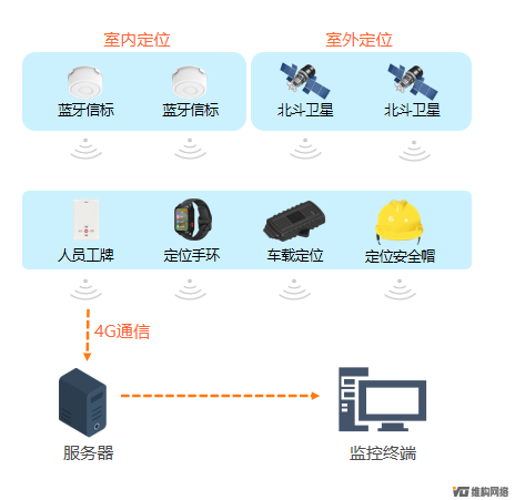 在室内扫描周边蓝牙信标的信息,在室外接收GPS或北斗卫星信号,以4G通信方式将位置信息发送到服务器;