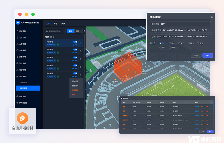 (1)电子围栏:根据管理自定义划定危险区域(如化工品车间),触发越界、滞留、长时间静止预警等,立即推送至管理人员,预防意外突发。