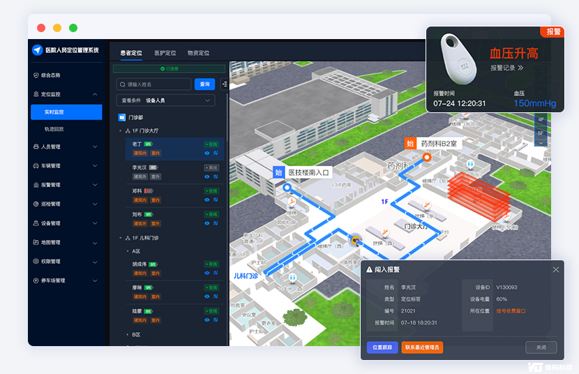 (1)实时定位与电子围栏:动态追踪特殊患者位置,越界、滞留、聚集自动告警。