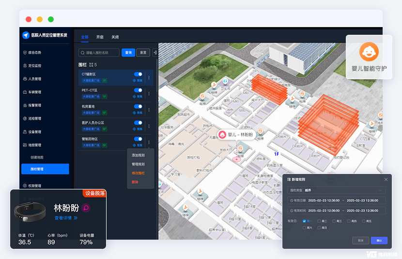 (2)区域智能管控:对产房、新生儿室等重点区域实现电子围栏防护。