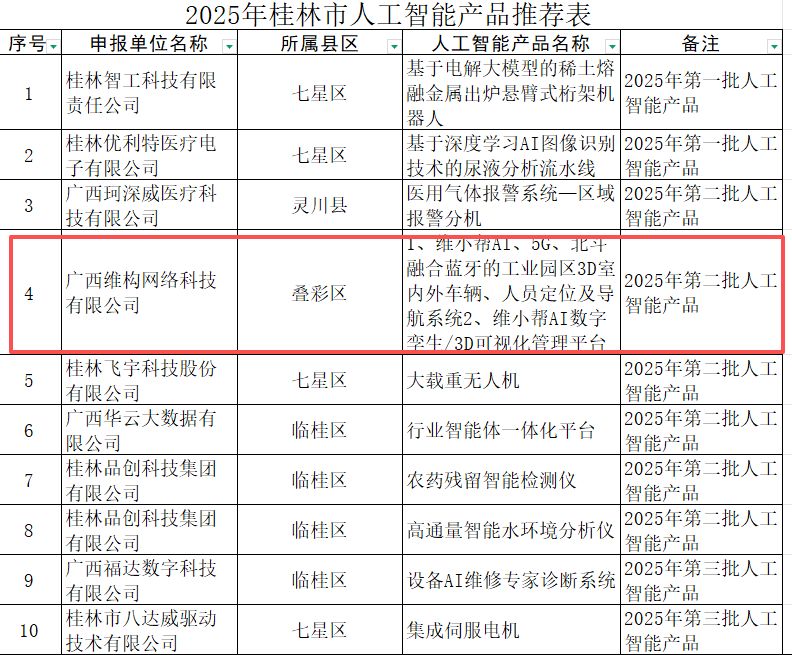 喜讯!广西壮族自治区工业和信息化厅正式公布了2025年第二批广西“人工智能+制造”产品推荐表,维构科技凭借在空间数字化与场景智能化领域的创新,自主研发的两项核心产品成功入选。